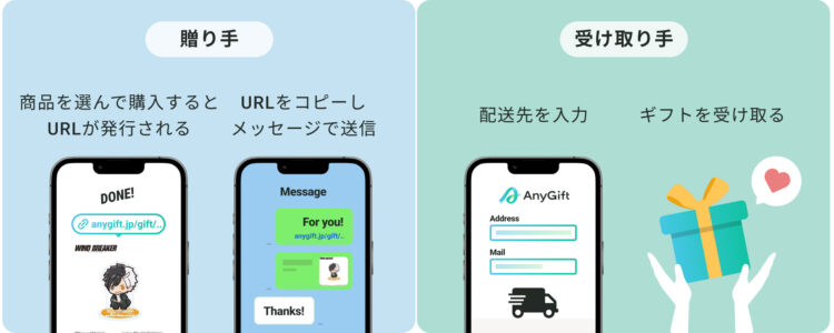 贈り手がグッズを購入し、支払い完了後にSNSやメール、チャットなどを使ってメッセージを送付すると、受け取り手が配送先を入力してギフトを受け取ることができます。