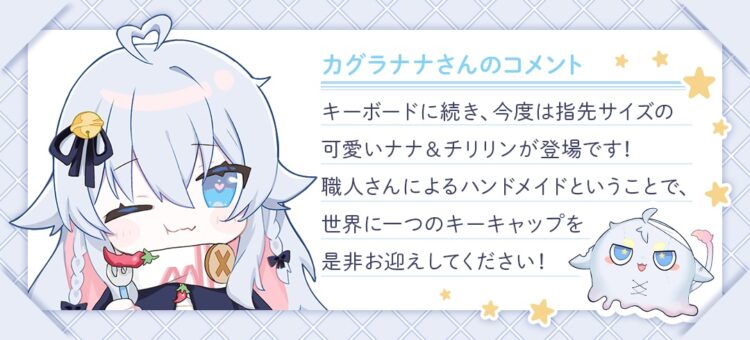 バーチャルアーティスト「カグラナナ」自身がプロデュースを手がける、AMICISとの限定コラボキーキャップが登場!思わず見つめたくなる「ちびナナ」と、一緒に並べたくなる「チリリン」の2つのキーキャップをご用意しました。カグラナナの世界を、指先サイズにぎゅっと凝縮。デスクに “ほっこり” を足したいすべての方にお届けします。