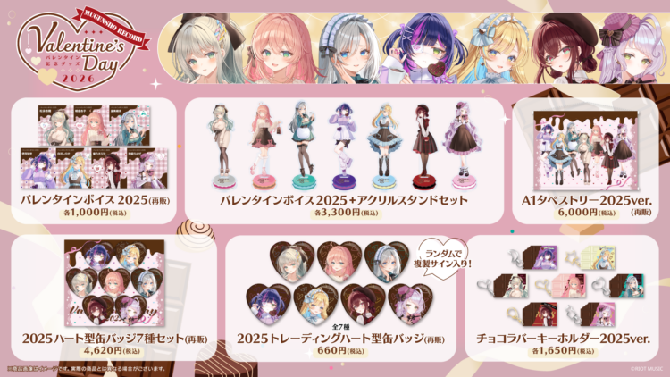 昨年ご好評いただいた「松永依織」「朝倉杏子」「皇 美緒奈」「伊月知世」「白河しらせ」「蜜乃木ジル」「時庭らんぜ」の2025年版バレンタイングッズの再販も開始いたしました。