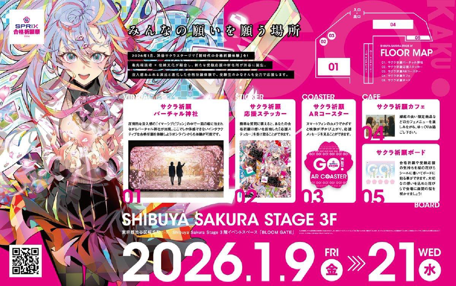「SPRIX合格祈願祭2026」は、SPRIXが実施している受験生応援プロジェクトのイベントで、渋谷区桜丘町1-1に位置する「渋谷サクラステージ」にて開催されました。イマーシブビジョンに映し出される「バーチャル神社」での没入型合格祈願体験を中心に、イベントを通じてテクノロジーとエンターテイメントの力で全ての受験生に応援メッセージをお届けしました。本イベントでは多くの渋谷を拠点とする企業様にもご協力いただきました。受験生応援プロジェクトは今後も受験生を応援するムーブメントを継続的に創出してまいります。