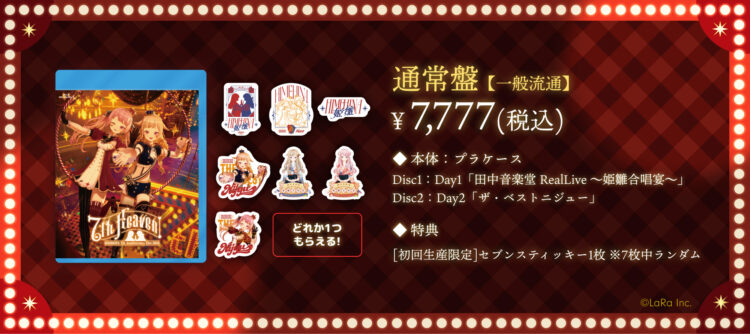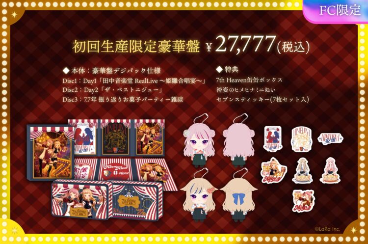 豪華盤は、袴姿が可愛い「袴姿のヒメヒナミニぬい」、ステッカー「セブンスティッキー(7枚セット)」に加えて追加ディスク「Disc3『7.7年 振り返りお菓子パーティー雑談』」を盛り込んだ豪華セットとなっており、さらにこれらの特典をひとつのBOXにまとめられる「7th Heaven缶缶ボックス」も付属します。